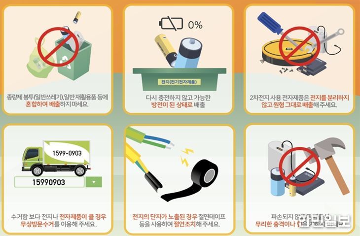 한편, 2차전지 등 폐기물의 안전한 배출과 수거를 위해서는 배출 요령을 숙지하고 이를 준수하는 시민들의 협조가 필요하다. 안전사고 예방을 위해 2차전지 폐기물 배출 시 △종량제봉투나 일반 재활용품에 혼합 배출 금지 △충전하지 않은 방전 상태로 배출 △2차전지가 내장된 제품은 전지를 분리하지 말고 원형 그대로 배출 △전지 단자가 노출된 경우 절연테이프나 비닐랩 등을 활용한 절연 조치 등 안전 수칙을 지키는 것이 중요하다.