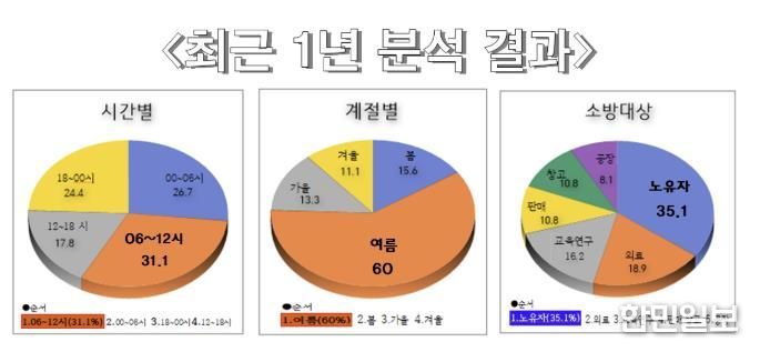 또한 최근 1년간 분석 자료에 따르면, 시간대별로는 오전06~12시가(31.1%) 가장 많이 발생했으며, 계절별로는 여름철이 전체의 60%를 차치해 집중 관리가 필요한 것으로 나타났다. 또한 소방대상별로는 노유자 시설이 35.1%로 가장 많았다고 조사됐다