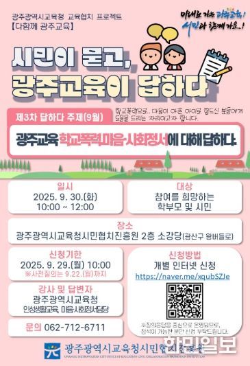 한민일보 서울포커스 박용남 기자 | 광주시교육청시민협치진흥원은 오는 30일 오전 10시부터 2시간 동안 본원 소강당에서 올해 세 번째 시민소통 행사 ‘시민이 묻고, 광주교육이 답하다’를 운영한다.