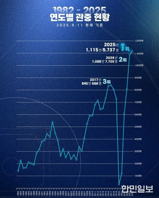 KBO 리그는 출범 첫 해인 1982년부터 지난 해까지 치러진 정규시즌 2만 2,860경기에서 누적 1억 8천 884만 1,044명으로 2억 관중 달성까지 1천115만 8,956명을 남겨두고 2025 시즌을 맞이했다. 어제 9월 11일(목)까지 1천115만9,737명의 관중이 입장하며 정규시즌 누적 2억 781명을 기록했다