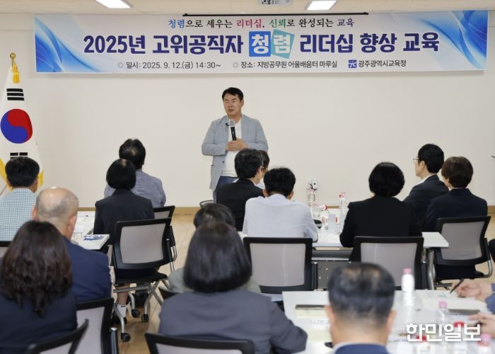 한민일보 서울포커스 박용남 기자 | 광주시교육청은 12일 시교육청 지방공무원어울배움터 마루실에서 본청 및 산하기관 4급(상당) 고위공직자 50여 명을 대상으로 ‘2025년 고위 공직자 청렴리더십 향상 교육’을 실시했다.