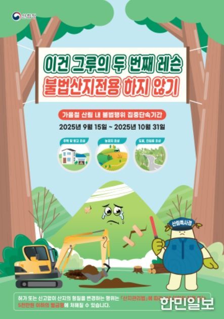 한민일보 서울포커스 진광성 기자 | 남부지방산림청은 가을철 임산물 수확기를 맞아 임업 생산자 및 산림생태계 피해 예방을 위해 전문 채취꾼, 등산객 등의 무분별한 임산물 굴 · 채취 단속에 나선다고 밝혔다.