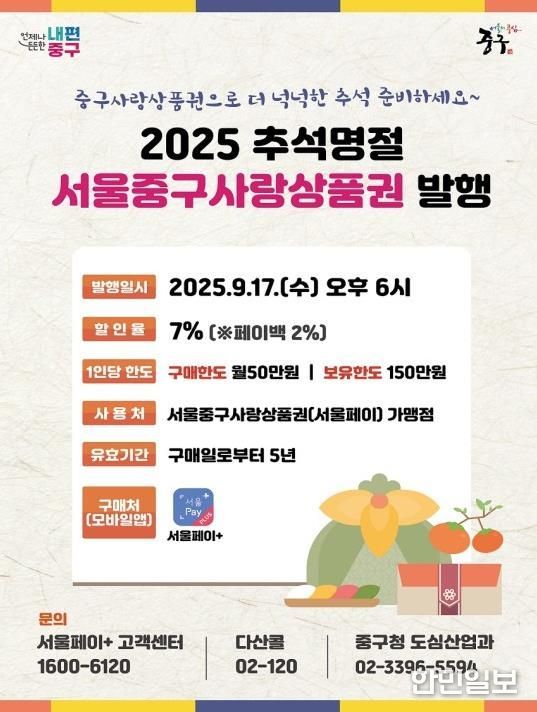 한민일보 서울포커스 김서윤 기자 | 서울 중구가 추석명절을 앞두고 오는 17일 오후 6시부터 총 30억 원 규모의 ‘서울중구사랑상품권’을 발행한다.