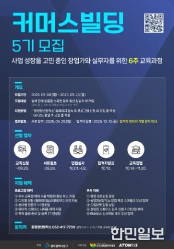 커머스빌딩 5기 프로그램은 10월 14일부터 6주간 오프라인 교육으로 운영되며, 실전 중심의 커리큘럼과 사후 지원을 통해 지역 청년 창업가들이 사업 역량을 강화할 수 있도록 도울 예정이다.