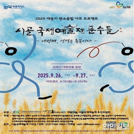 한민일보 서울포커스 진광성 기자 | 전북특별자치도와 전북탄소중립지원센터(전북연구원)는 9월 15일부터 27일까지 김제시 만경읍 대동마을에서 '2025 탄소중립 시골국제예술제 푼수들'을 개최한다고 밝혔다.
