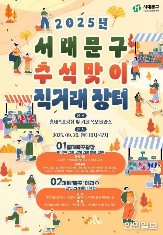 구는 이달 20일 토요일 오전 10시부터 오후 5시까지 홍제폭포광장과 카페 ‘폭포’ 테라스 일대에서 ‘추석맞이 직거래장터’를 개최한다.
