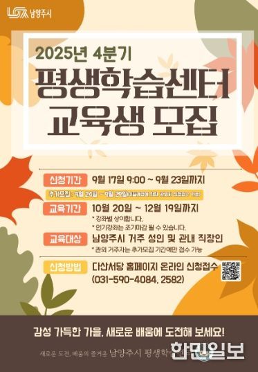 한민일보 서울포커스 김성윤 기자 | 남양주시는 성인들의 직업능력 향상과 진로 역량 강화를 지원하기 위해 오는 9월 17일부터 23일까지 2025년 평생학습센터 4분기 단기 프로그램 교육생을 모집한다고 15일 밝혔다.