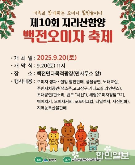 한민일보 서울포커스 김서윤 기자 | 함양군 백전면에서 지역 대표 특산물인 오미자를 주제로 한 '제10회 지리산함양 백전오미자축제'가 오는 9월 20일, 백전면 다목적광장에서 개최된다.