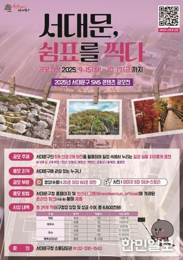 한민일보 서울포커스 김서윤 기자 | 서대문구가 일상 가운데 누리는 지역의 자연 명소를 SNS로 널리 알리기 위해 ‘2025 SNS 콘텐츠 공모’를 진행한다.