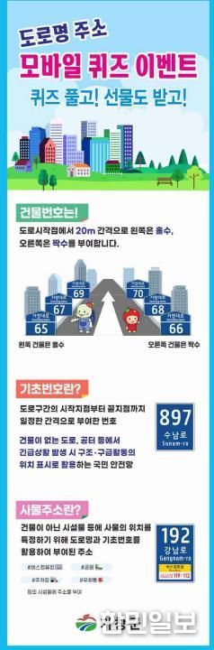 군 관계자는 “도로명주소의 간단한 부여 원리만 이해하면 낯선 장소 어디를 가더라도 목적지를 쉽게 찾을 수 있다”며, “앞으로도 다양한 홍보를 통해 군민들이 주소정책을 쉽게 이해할 수 있도록 노력하겠다”고 말했다.