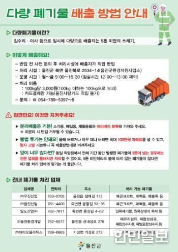 한민일보 서울포커스 김서윤 기자 | 울진군은 군민의 불편을 해소하고 폐기물 처리의 효율성을 높이기 위해 다량 폐기물 처리 절차를 간소화한다.