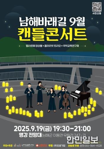 한민일보 서울포커스 김서윤 기자 | 남해군관광문화재단은 오늘 9월 19일 오후 7시 30분부터 이동면 앵강전망대(앵강휴게소)에서 ‘2025 남해바래길 작은음악회 – 9월 캔들콘서트’를 개최한다.