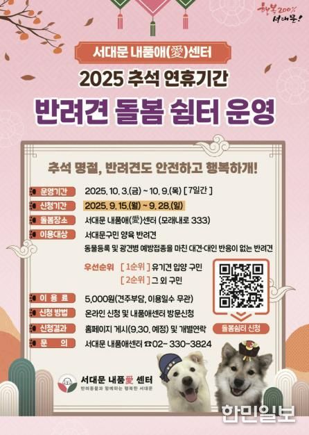 한민일보 서울포커스 김서윤 기자 | 서대문구가 개천절과 주말, 추석 연휴가 이어지는 다음 달 3일부터 9일까지 7일 동안 ‘서대문 내품애(愛)센터’(모래내로 333)에 ‘반려견 돌봄 쉼터’를 운영한다.