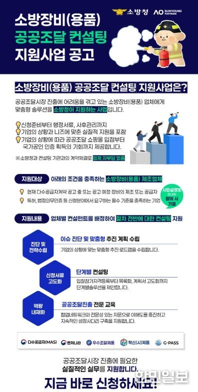 한민일보 서울포커스 최성훈 기자 | 소방청은 국내 소방산업체의 성장을 지원하기 위해 추진해 온 '소방장비 공공조달 컨설팅' 사업의 범위를 소방용품까지 확대하고 오는 9월 29일 참여 희망 기업을 대상으로 ‘사업설명회’를 개최한다고 밝혔다.
