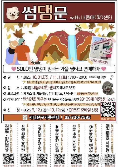한민일보 서울포커스 김서윤 기자 | 서대문구는 서대문구가족센터가 10월 31일과 11월 1일 서대문 내품애(愛)센터(모래내로 333)에서 반려견을 키우는 미혼남녀 만남 행사 ‘썸댕문 with 내품애센터’를 개최한다고 17일 밝혔다.