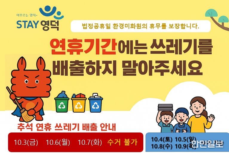 한민일보 서울포커스 진광성 기자 | 영덕군은 환경미화원의 휴무를 보장하고 업무 능률을 높이기 위해 추석 연휴 기간인 다음 달 3, 6, 7일 사흘간 쓰레기 수거 업무를 일시적으로 중단한다.