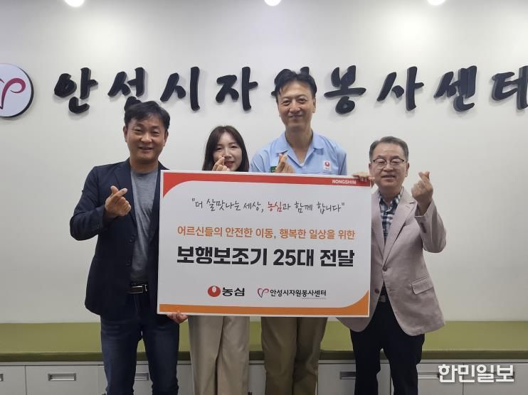 ㈜농심 안성공장은 저소득층 어르신들을 위해 25대의 보행 보조기를 안성시자원봉사센터에 전달했으며, 이는 거동이 불편해 어려움을 겪는 어르신들의 생활 편의와 안전을 높이는 데 쓰인다.
