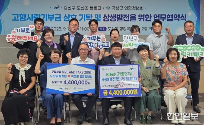 한민일보 서울포커스 박용남 기자 | 광주 광산구 도산동 통장단(단장 박창곤)과 전남 곡성군 연합청년회(회장 오종국)가 지난 12일 도산동 행정복지센터 2층 회의실에서 고향사랑기부제 상호 협약을 체결했다.