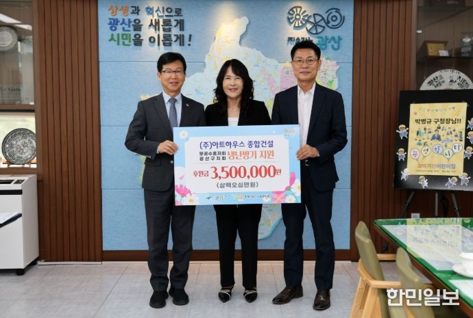 한민일보 서울포커스 박용남 기자 | ㈜아트하우스종합건설(대표 윤강미)가 지난 16일 구청장실에서 대한무공수훈자회 광산구지회(회장 백승문) 노후 냉난방기 교체를 위해 후원금 350만 원을 후원했다.