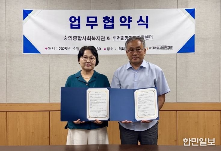 한민일보 서울포커스 백진욱 기자 | 인천 미추홀구 숭의종합사회복지관(관장 : 고성란)은 2025년 9월 16일, 인천희망지역자활센터(센터장 : 이종만)와 지역사회 복지 증진과 취약계층 자립 지원 강화를 위한 업무협약(MOU)를 체결했다.