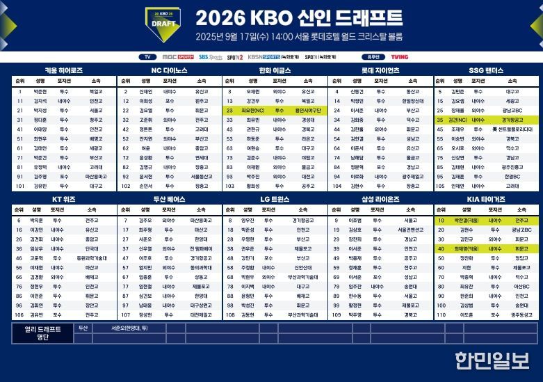 한민일보 서울포커스 최성훈 기자 | 2026 KBO 신인 드래프트 결과