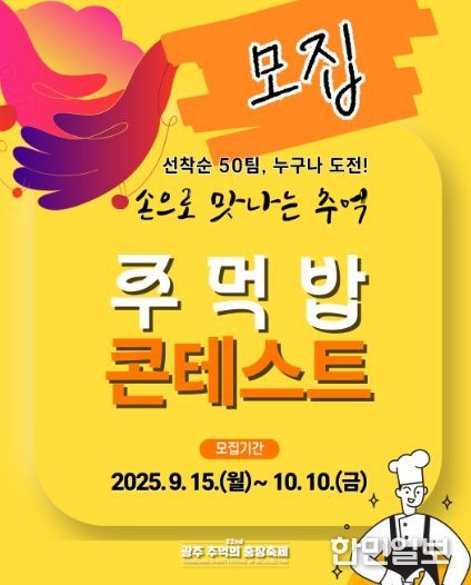 한민일보 서울포커스 박용남 기자 | 광주 동구는 오는 10월 15~19일 개최하는 ‘제22회 광주 추억의 충장축제’ 기간 중 핵심 콘텐츠로 진행될 ‘주먹밥 콘테스트-손으로 맛나는 추억’에 참여할 참가자를 10월 10일까지 모집한다고 밝혔다.