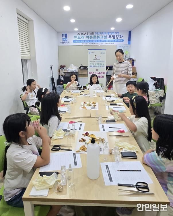 한민일보 서울포커스 진광성 기자 | 수원시 팔달구 인계동 주민자치회는 9월 16일 인도래작은도서관에서 '인도래 아동돌봄 교실' 제8강 드라이플라워 디퓨저 만들기 수업을 진행했다.