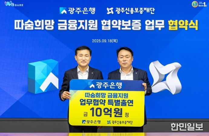 한민일보 서울포커스 임철현 기자 | 광주은행은 18일, 광주은행 본점에서 고병일 광주은행장과 염규송 광주신용보증재단 이사장 및 관계자가 참석한 가운데, 광주광역시 소상공인 금융지원을 위한 ‘따숨희망 금융지원 업무협약’을 체결했다고 밝혔다.