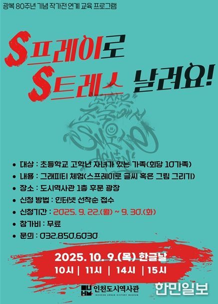 한민일보 서울포커스 유창렬 기자 | 인천광역시 인천도시역사관은 광복 80주년 기념 작가전의 연계행사인 ‘스(S)프레이로 스(S)트레스를 날려요’를 10월 9일 한글날에 맞춰 운영한다고 밝혔다.