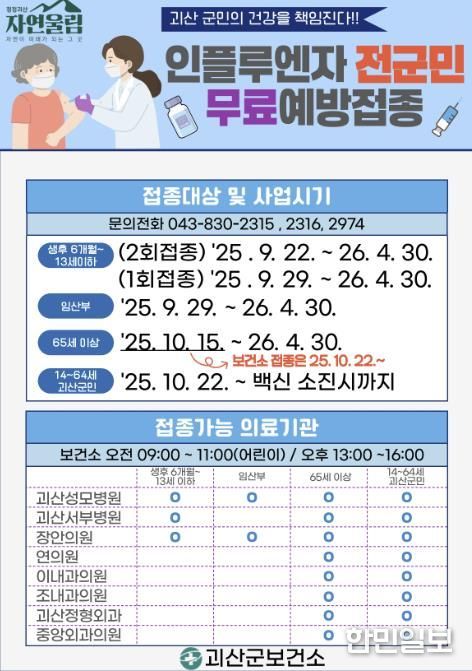한민일보 서울포커스 김다남 기자 | 충북 괴산군은 2025-2026절기 전 군민을 대상으로 무료 인플루엔자(독감) 예방접종을 실시한다고 19일 밝혔다.