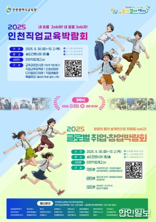 한민일보 서울포커스 유창렬 기자 | 인천광역시교육청은 9월 30일부터 10월 2일까지 3일간 송도컨벤시아에서 ‘2025 인천직업교육박람회’와 ‘2025 글로벌 취업·창업박람회’를 동시 개최한다고 19일 밝혔다.
