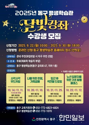 한민일보 서울포커스 백진욱 기자 | 인천 동구는 구민들의 평생학습 참여 기회 확대하기 위하여 야간에 진행하는 ‘달빛강좌’를 개설하고 수강생을 모집한다고 밝혔다.