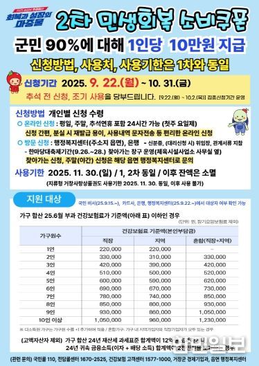 군은 9월 22일부터 10월 2일까지 집중 신청기간을 운영하며, 군민들에게 추석 전 신청과 조기 사용을 당부했다. 이번 2차 신청은 첫 주에 한해 온라인 신청만 요일제가 적용되며, 읍·면 행정복지센터를 통한 방문 신청은 요일제 상관없이 가능하다. 다만, 초기 혼잡을 줄이기 위해 분산 방문을 권장했다.