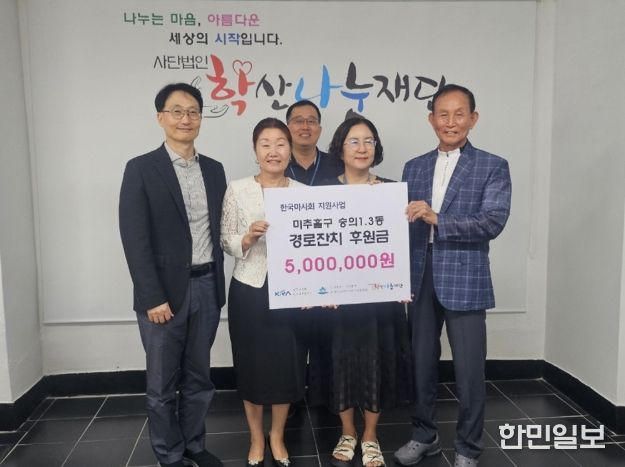 한민일보 서울포커스 백진욱 기자 | 미추홀구 숭의1·3동 지역사회보장협의체(위원장 민명숙)는 한국마사회 인천미추홀지사(지사장 조영진)의 공모사업에 ‘숭의1·3동 경로잔치’가 선정돼 지난 18일 기부금 500만 원을 전달받았다.