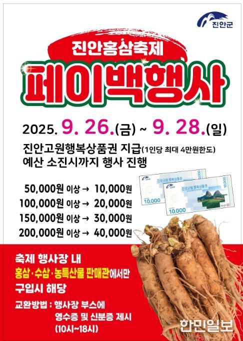 한민일보 서울포커스 박용남 기자 | 진안군홍삼한방클러스터사업단은 오는 9월 26일부터 28일까지 열리는 '2025 진안홍삼축제'에서 홍삼·수삼·농특산물 소비 촉진과 지역 상권 활성화를 위해 페이백 행사를 운영한다.