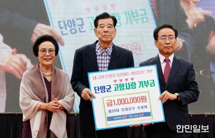 한민일보 서울포커스 김다남 기자 | 충북 단양군은 지난 19일 단양 공설운동장에서 열린 신단양 이주 40주년 기념식에서 제20대 단양군수를 역임한 오병하 전 군수가 고향사랑기부금 100만 원을 기탁했다고 밝혔다.