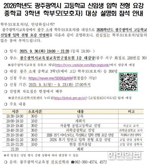 한민일보 서울포커스 박용남 기자 | 광주시교육청은 오는 30일 오후 7시 광주시교육청교육연구정보원 대강당에서 중학교 3학년 학생과 학부모를 대상으로 ‘고입 전형요강 설명회’를 개최한다.