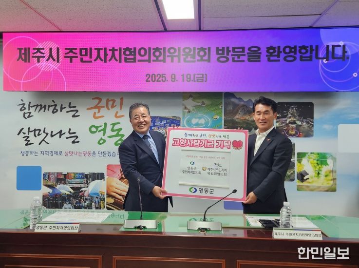 한민일보 서울포커스 김다남 기자 | 충북 영동군 주민자치협의회(회장 김재구)는 지난 19일, 2025 영동세계국악엑스포 개최를 축하하기 위해 영동군을 방문한 제주시 주민자치위원회협의회(회장 고정학)와 고향사랑기부금 상호 기부식을 진행했다고 밝혔다.