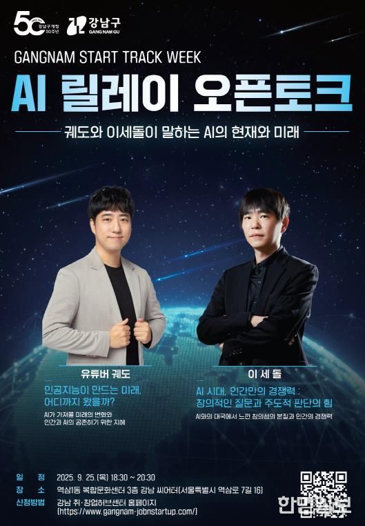 구민을 위한 AI 릴레이 강연도 마련됐다. 25일 오후 6시 30분 역삼1동 복합문화센터 강남씨어터에서 유튜브 채널 ‘안될과학’의 궤도가 ‘AI가 가져올 미래와 인간의 지혜’를, 프로 바둑기사 출신 이세돌이 ‘AI 시대, 인간만의 경쟁력’을 주제로 강연한다.