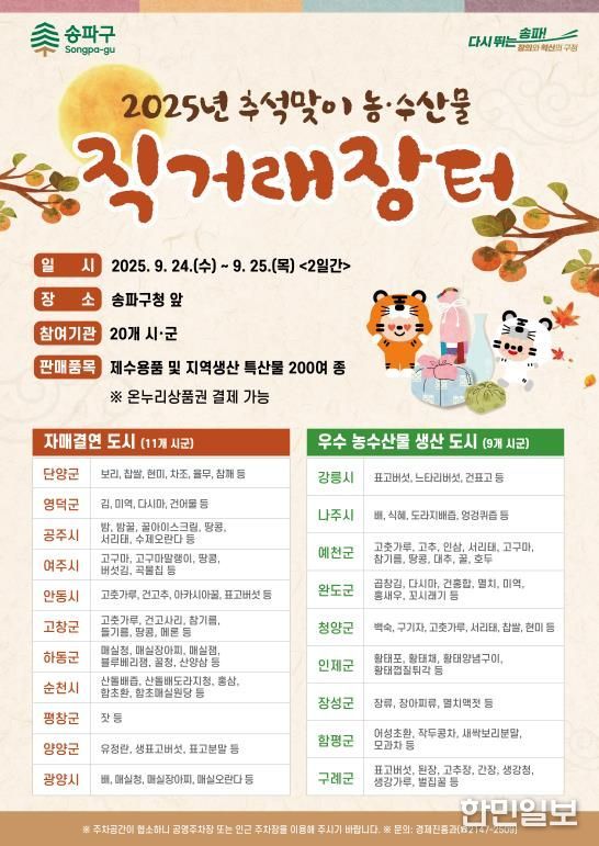 한민일보 서울포커스 박정민 기자 | 송파구는 민족 최대 명절 추석을 맞아 오는 9월 24일과 25일 이틀간 구청 앞에서 ‘추석맞이 농·수산물 직거래장터’를 운영한다고 밝혔다.