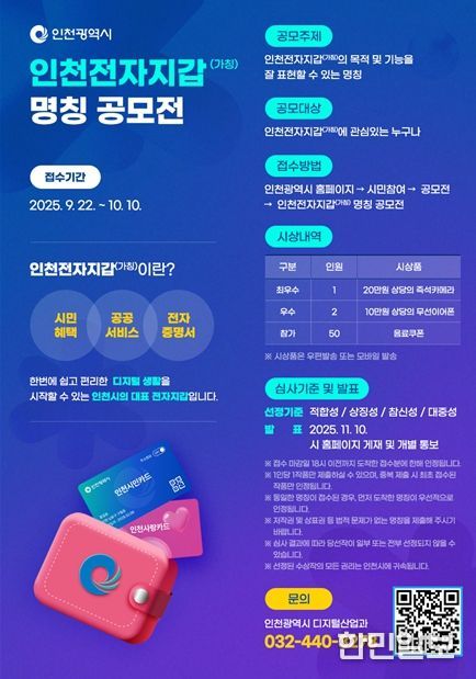 한민일보 서울포커스 유창렬 기자 | 인천광역시는 시민들에게 더욱 편리한 디지털 생활을 제공하기 위해 도입하는 블록체인 기반 비대면 공공서비스 앱 ‘인천전자지갑(가칭)’의 명칭 공모전을 9월 22일부터 10월 10일까지 19일간 진행한다고 밝혔다.