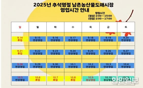 한민일보 서울포커스 유창렬 기자 | 인천광역시 남촌농축산물도매시장관리사무소는 다가오는 추석 명절을 맞아 시민들이 안전하고 편리하게 도매시장을 이용할 수 있도록 종합대책을 마련·추진한다고 밝혔다.