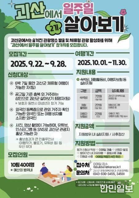 한민일보 서울포커스 김다남 기자 | 충북 괴산군은 오는 28일까지 ‘괴산에서 일주일 살아보기’ 참가팀을 모집한다고 22일 밝혔다.