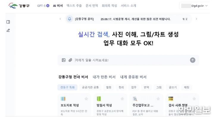 ‘생성형 AI 업무 지원 서비스’는 강동구가 최신 생성형 인공지능(AI) 모델인 GPT-5을 기반으로 다양한 실무에 적용할 수 있도록 구축한 통합 플랫폼이다.