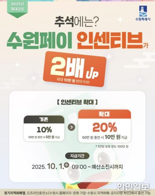 한민일보 서울포커스 진광성 기자 | 수원시가 추석 명절을 맞아 10월 수원페이 인센티브를 20%로 확대한다.