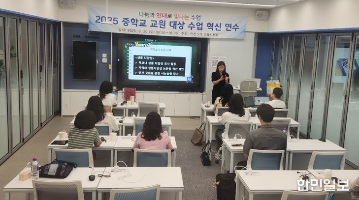 한민일보 서울포커스 유창렬 기자 | 인천광역시교육청은 20일 제물포AI융합교육센터에서 관내 5개 교육지원청 주관으로 ‘2025 중학교 교원 대상 수업혁신 연수’를 운영했다고 밝혔다.