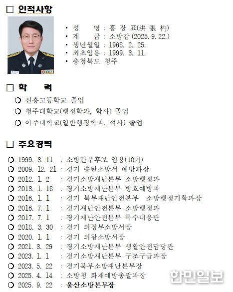 한민일보 서울포커스 임경복 기자 | 울산시 소방본부는 신임 소방본부장으로 홍장표 소방감이 22일자로 취임한다고 밝혔다.