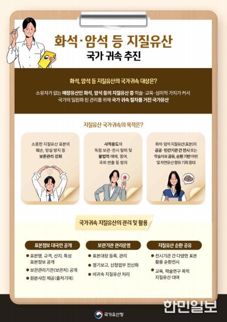 국가유산청은 2020년부터 국공립기관과 대학, 사립기관, 개인 소장자가 보유한 화석이나 암석 같은 지질유산 보유현황을 전수조사하고, 이를 ‘지질유산 표본정보서비스’에 등록하는 지질유산 데이터베이스 구축사업을 수행하고 있다. 관계 전문가의 현장 실사와 가치평가를 통해 각 지질유산에 대한 국가귀속 여부를 판단하며, 최종 국가귀속된 지질유산은 지정된 보관관리기관에서 보존·관리되고, 필요시 추후 건립될 국립자연유산원에서 교육·전시 등을 위한 자원으로 활용될 예정이다. 또한, 국가유산청은 관련 학회, 연구기관과의 긴밀한 협력을 통해 학술적·교육적 활용도 지원할 예정이다.