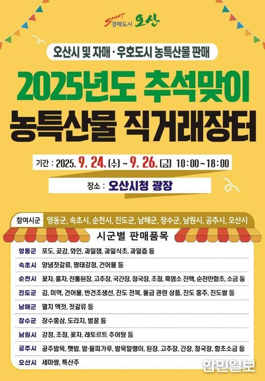 한민일보 서울포커스 임경복 기자 | 오산시는 민족 최대 명절 추석을 맞아 오는 24일(수)부터 26일(금)까지 3일간 오산시청 광장에서 ‘추석맞이 자매도시 농특산물 직거래장터’를 개최한다고 밝혔다.