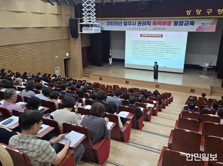 한민일보 서울포커스 김다남 기자 | 청주시는 22일 상당구청 대공연장에서 시 기관장과 고위직 공무원 185명을 대상으로 직장 내 4대 폭력(성희롱,성매매,성폭력,가정폭력) 예방 통합교육을 실시했다.